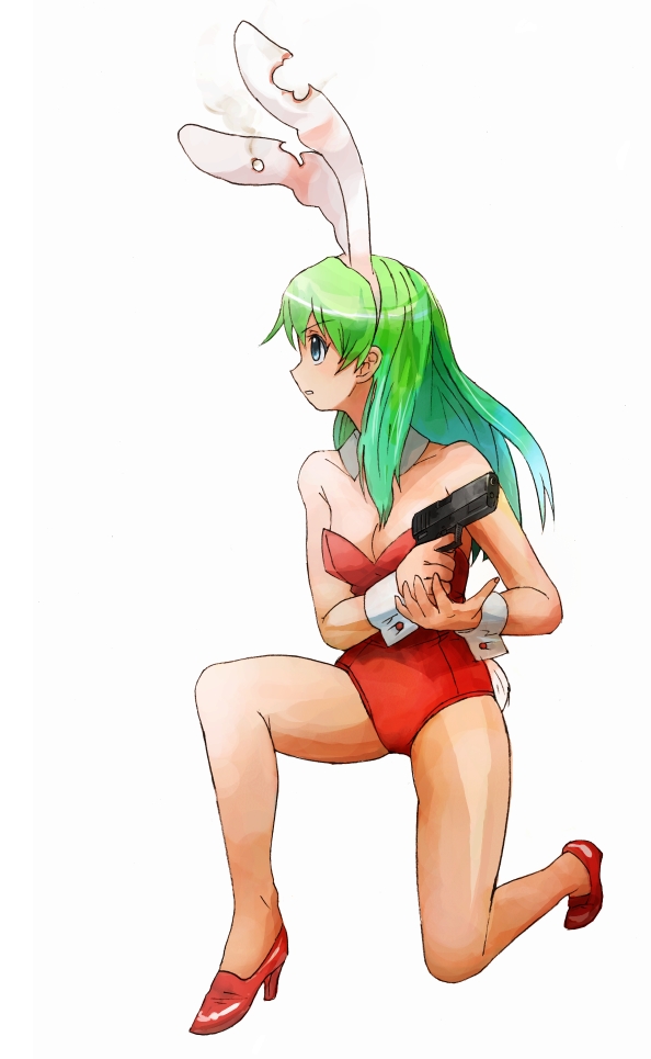 1girlanimal earsbare legsblue eyesbreastscleavagefake animal earsfemale focusgreen eyesgunlong hairplayboy bunnyrabbit earssoloweapon