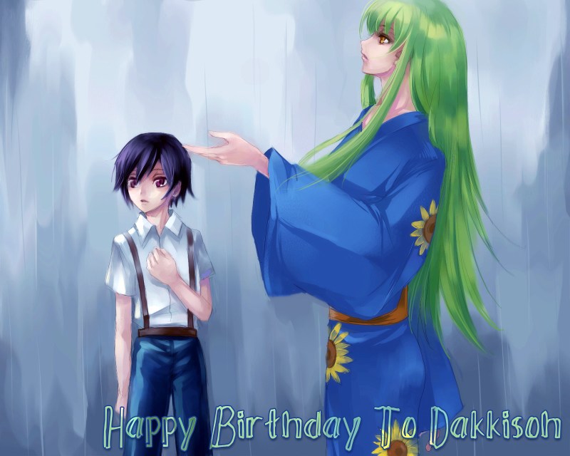 00saged downblack hairchildflowergreen hairjapanese clotheskimonolong hairpurple eyesrainsunflowersuspenderswetyellow eyes