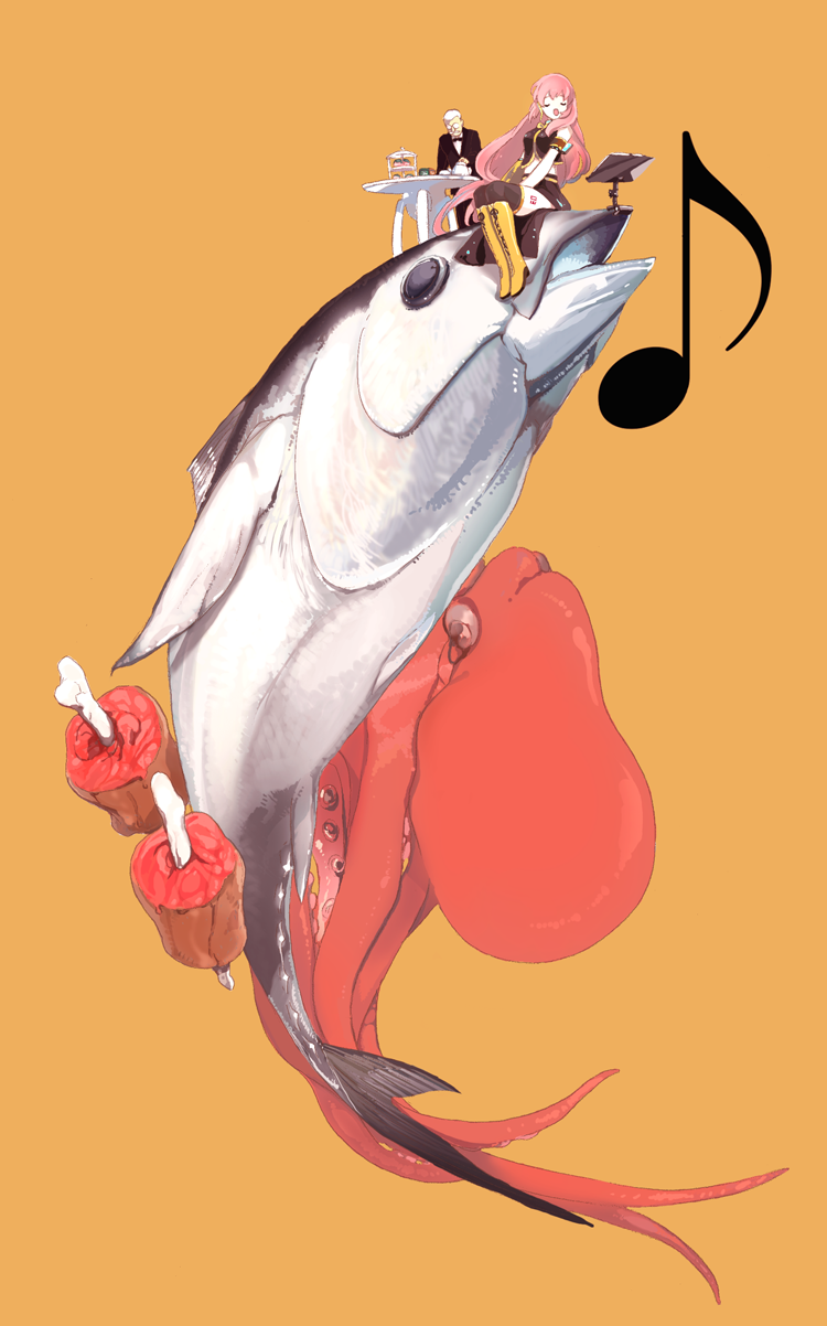 boned meatbootsfishfoodlong hairmeatmusical notenoteoctopuspink hairsimple backgroundsquidsurrealtablevery long hairwaiter