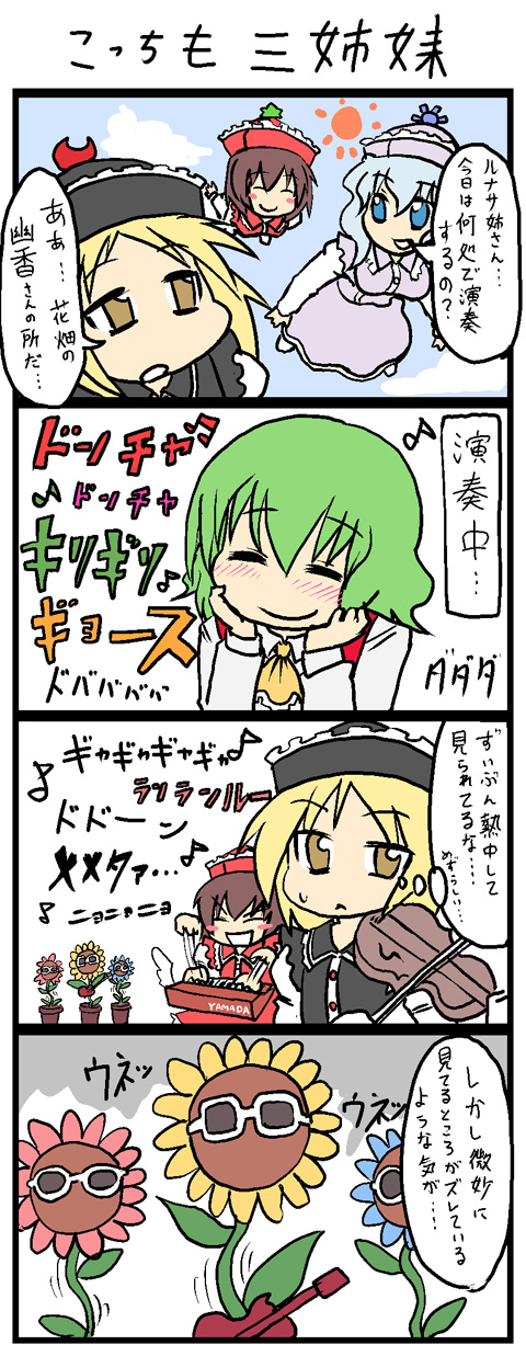 1boy4komaascotblonde hairblue eyesblue hairblushblush stickersbrown hairclosed eyescomicdancing flowerfemale focusflowerflyinggreen hairguitarhappyhathead restinstrumentkeyboardkeyboard (instrument)musical notesmilesunsunglassesvestviolinyellow eyes