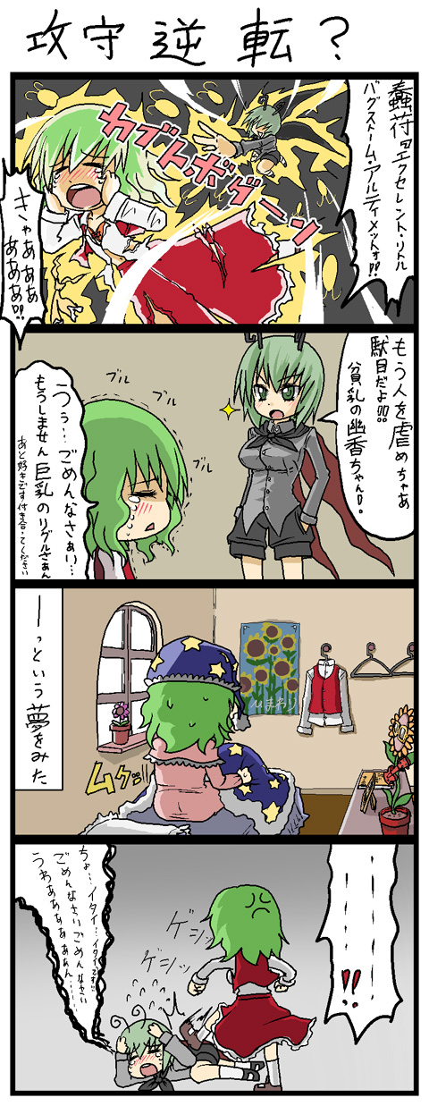 2girls4komaanger veinantennaebrabreastscapecomicdancing flowerdreamingdual personafemale focusflowergreen eyesgreen hairhatimpossible clothesimpossible shirtlingeriemultiple girlsnightgownrole reversalshirtskirtskirt setsparklestompingsunglassestearstorn clothestremblingunderwearvest