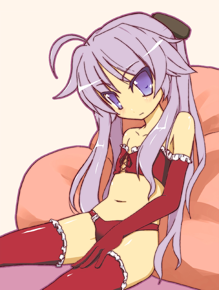 00s1girlblue eyesbustierelbow glovesfemale focusflat chestgloveslingerienavelpantiespurple hairred pantiessittingsolothighhighsunderwear