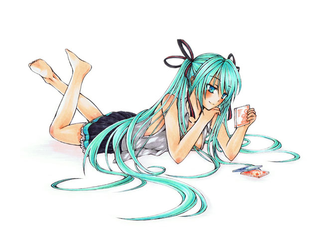 aqua eyesaqua hairbare shouldersbarefootcdfeethair ribbonlong hairribbonskirttwintailsvery long hair