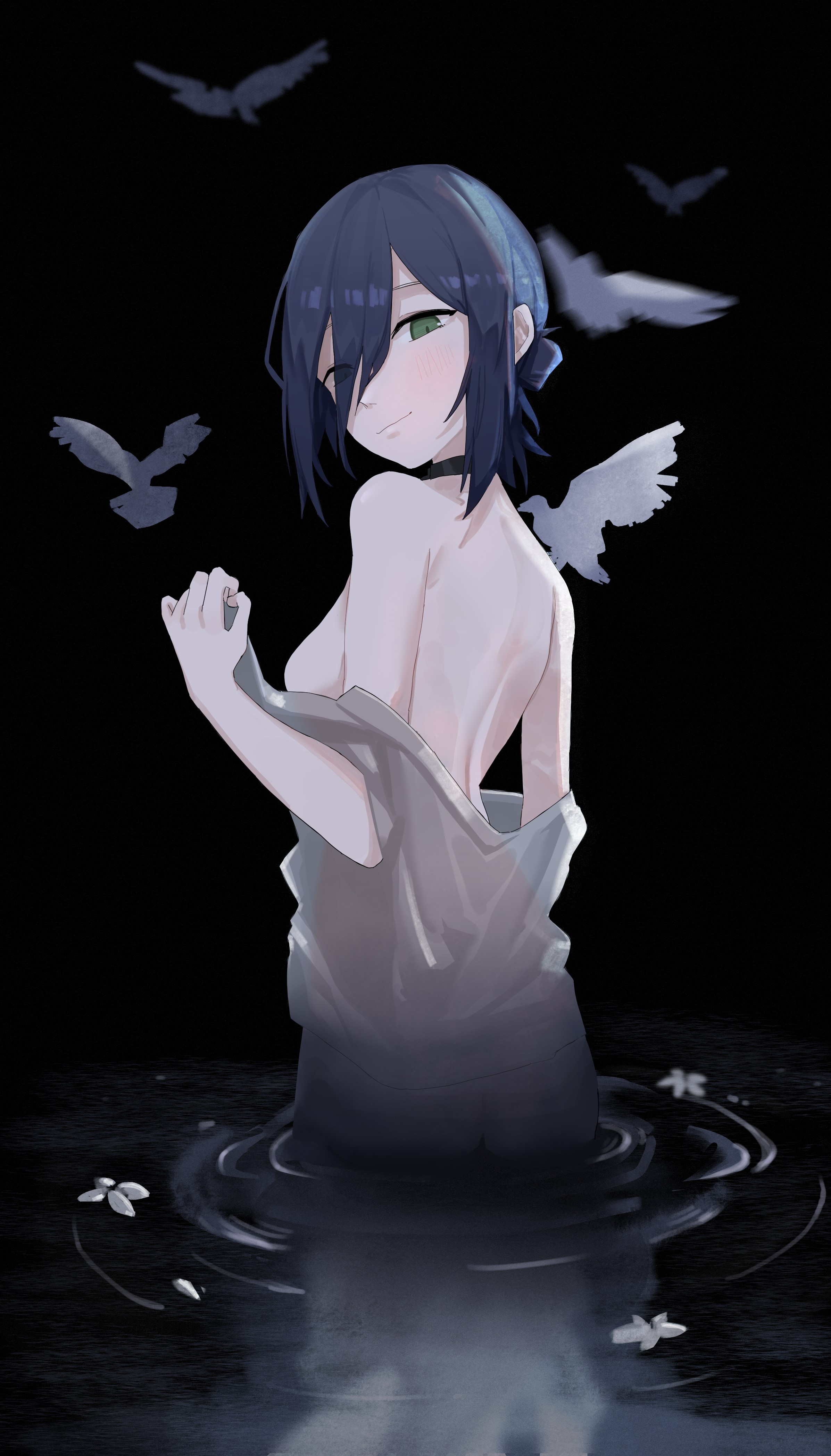 1girlbirdblack chokerblack hairbreastschokerclosed mouthgreen eyeshair bunlooking at viewersmall breastssolowadingwater