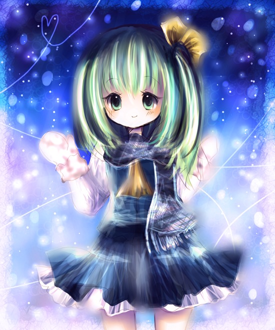1girlfemale focusgreen eyesgreen hairmatching hair/eyesmittensscarfshort hairside ponytailsnowsolo