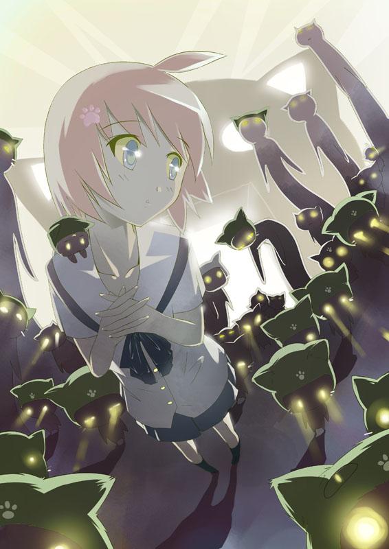 hishimatope, chito (shoujo shuumatsu ryokou), yuuri (shoujo shuumatsu ryokou), shoujo shuumatsu ryokou, highres, > <, 2girls, :3, = =, ahoge, alternate costume, alternate hairstyle, black eyes, black hair, black neckerchief, blonde hair, blush, breasts, chibi, closed eyes, donut, food, holding, holding donut, holding food, medium breasts, multiple girls, neckerchief, open mouth, school uniform, short sleeves, sidelocks, smile, x3