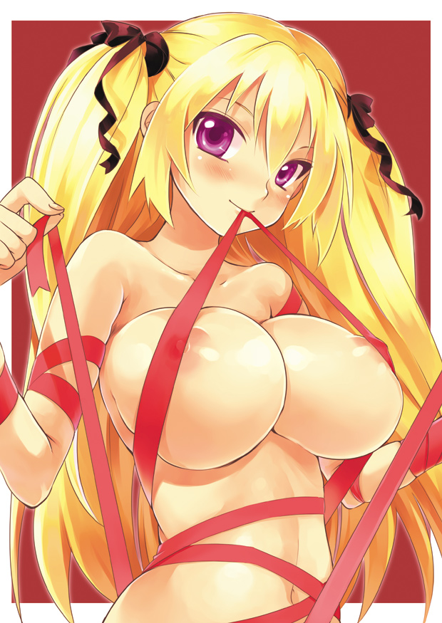 1girlblonde hairblushbreastsfemale focushair ribbonhuge breastsmouth holdnaked ribbonnavelnudepurple eyesribbonsolotwintailswrapping