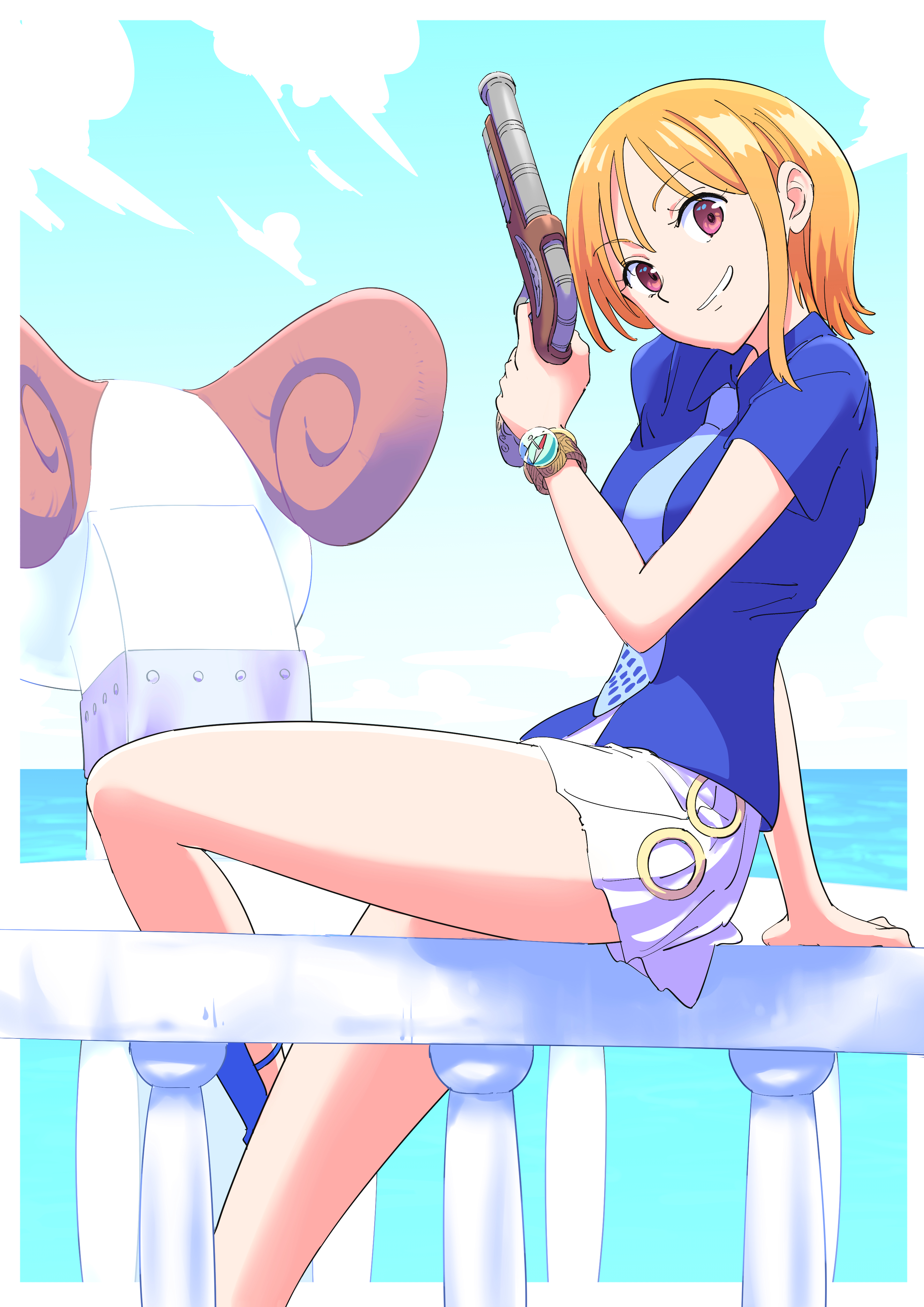1girlarm supportbanglebare legsblue sandalsblue shirtblue skybraceletbreastsbrown eyescloudcloudy skyfeet out of framefrom sidegunhair behind earholdingholding gunholding weaponhorizonjewelrylegslog poselooking at viewermedium breastsminiskirtnecktieoceanofficial alternate costumeorange eyesorange hairoutdoorsparted lipspirate shippleated skirtsandalsshirtshort hairshort sleevessingle sidelocksittingskirtskysolothighsweaponwhite skirt