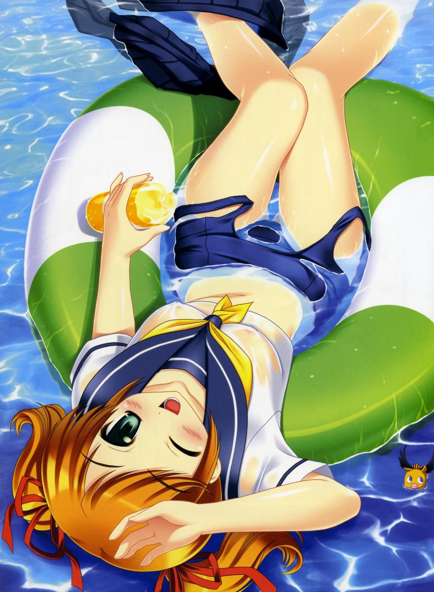 1girlblushclothes pullfemale focusinnertubelyingone eye closedone-piece swimsuit pulloutdoorspoolschool uniformsee-through clothesskirtskirt pullsmilesoloswim ringswimsuitswimsuit under clotheswaterwetwink