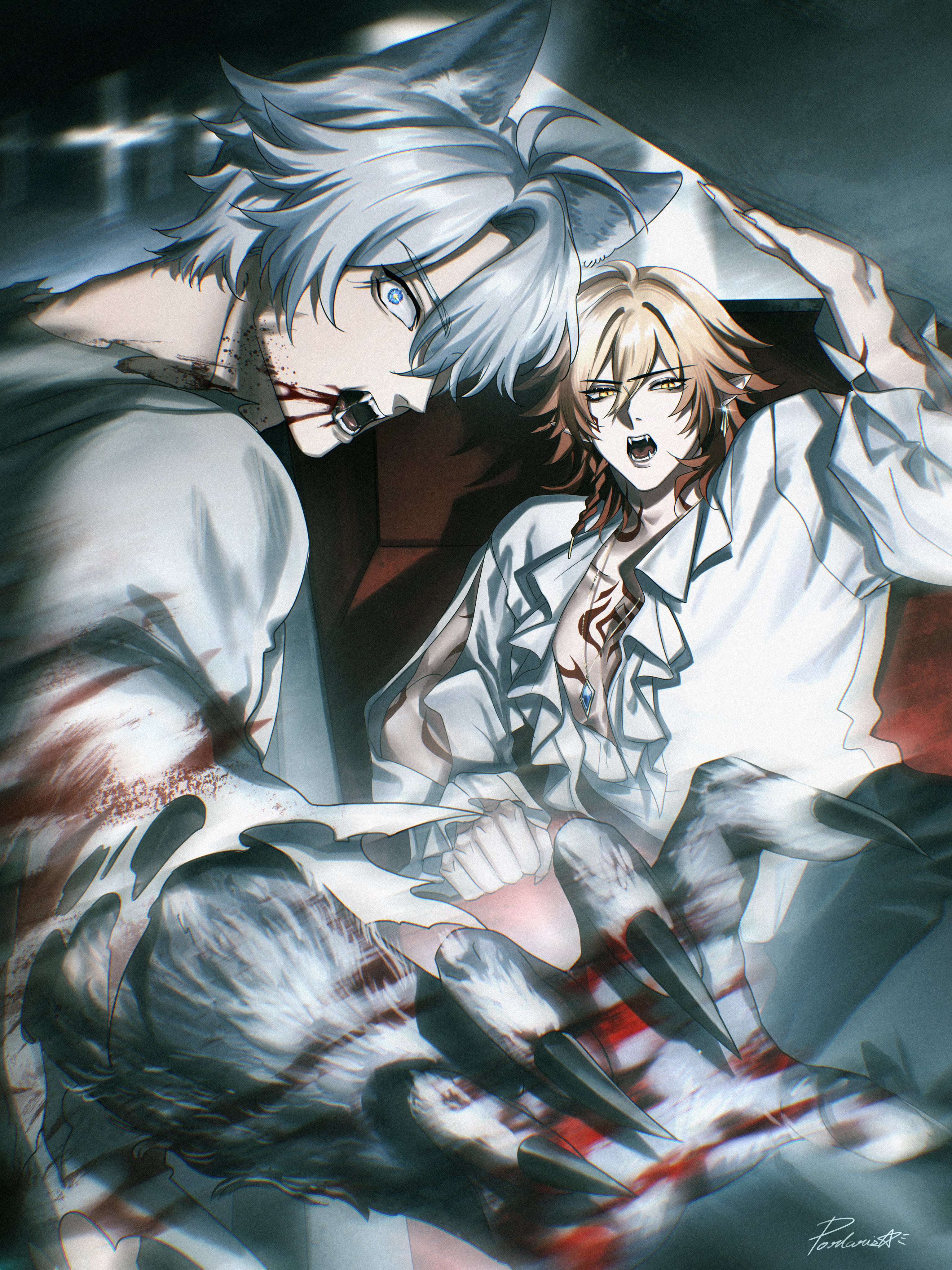 2boysalternate costumealternate universeanimal earsartist nameblonde hairbloodblue eyesbraidchest tattoojewelrymale focusmedium hairmultiple boysnecklaceporlarisartred hairshort hairside braidsingle braidtattooupper bodyvampirewerewolfwolf earswolf paws