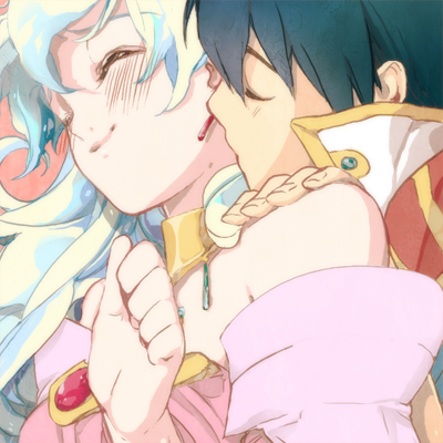 00s1boy1girlbare shouldersblue hairblushchokerclosed eyescoupledressheterokisslong hairmulticolored hairpink dresssmile
