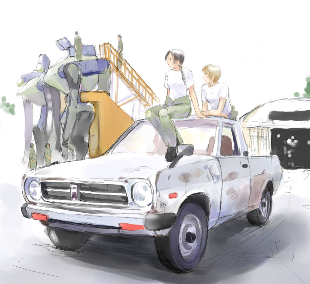 2girls4boysblack hairbraidbrown hairhangarlong hairmechamotor vehiclemultiple boysmultiple girlspickup truckrobotshirtshort hairsingle braidsittingslice of lifet-shirttruckvehicle focus