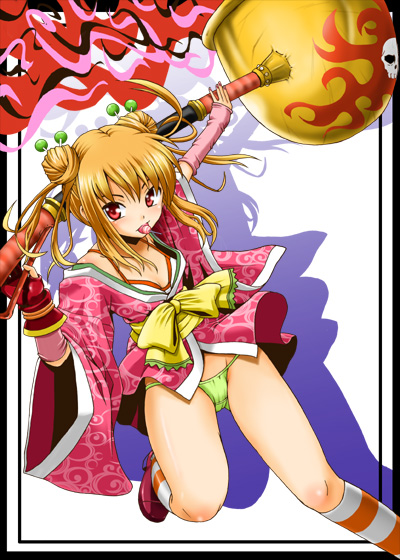 bowbradouble bunfingerless glovesgloveshair bunhammerhuge weaponjapanese clotheskneehighslingeriemouth holdpantiesribbonskullsockssolostriped clothesstriped socksunderwearweapon