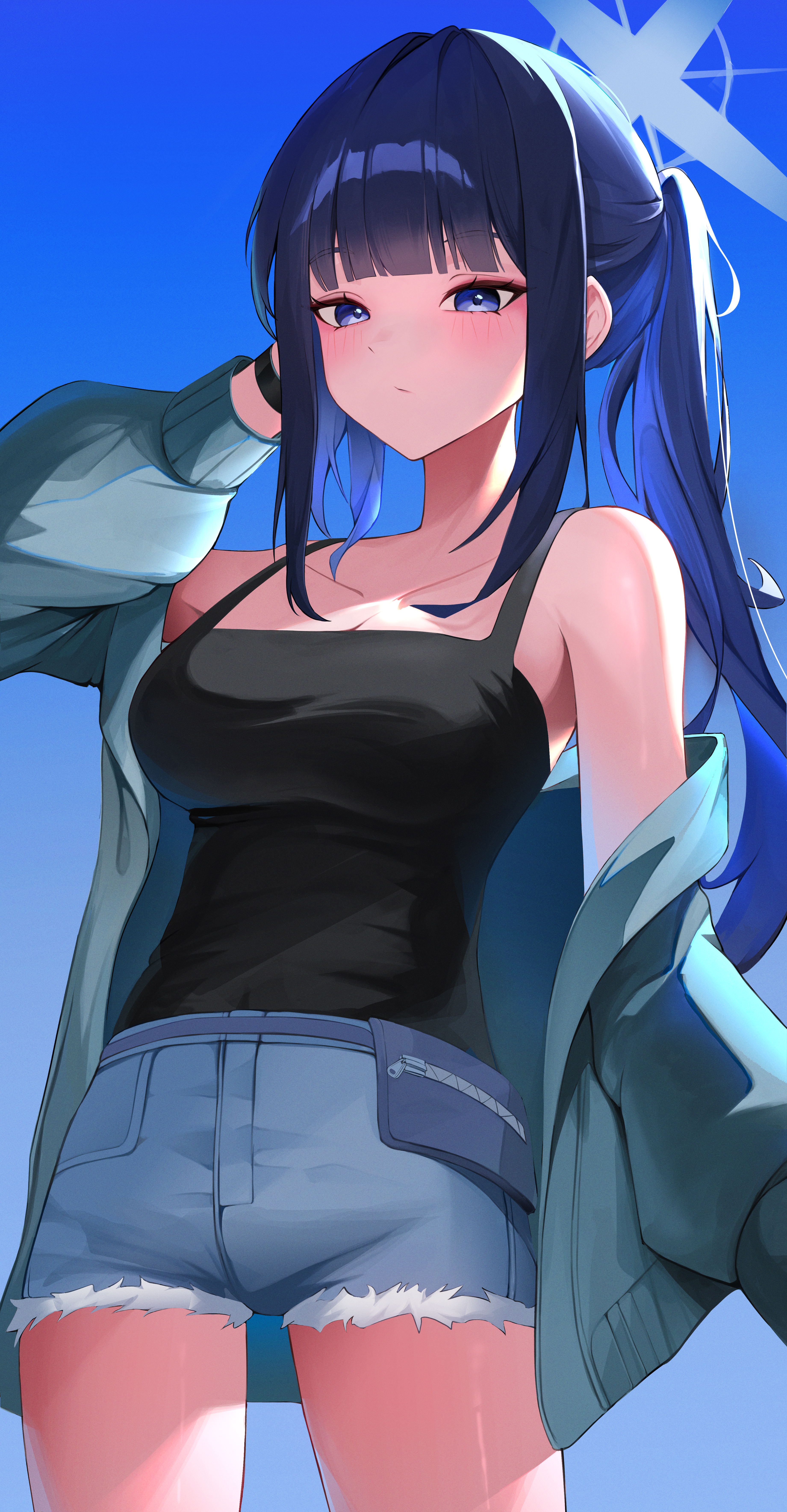 1girlalternate costumeblack tank topblue backgroundblue eyesblue hairbreastscardigancleavagecollarbonecovered navelcowboy shotcutoffsdenimdenim shortsgradient backgroundgrey cardigangrey halohalf updohalolarge breastslong hairlong sidelockslong sleevesoff shoulderopen cardiganopen clothesshort shortsshortssidelockssolostandingtank top