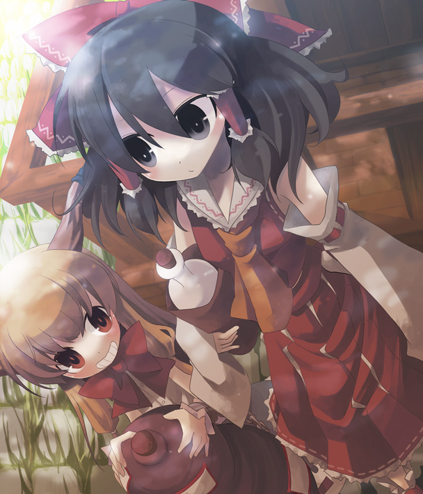 2girlsblack hairbrown hairdetached sleevesfemale focusgrinhornsjapanese clotheslong hairmikomultiple girlsnatureoutdoorsplantribbonsmile