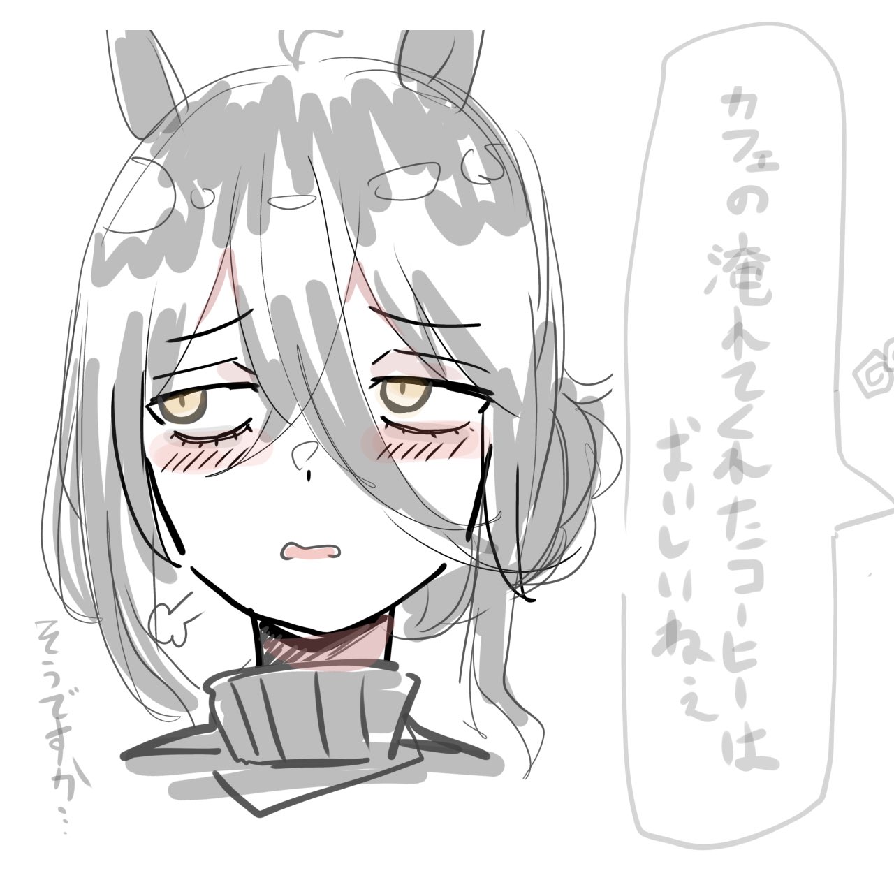 1girlahogeanimal earsblack hairbrown eyescropped shouldershair between eyeshair bunhorse earslooking to the sidemulticolored hairparted lipsportraitsimple backgroundsoloturtlenecktwo-tone hairwavy mouthwhite backgroundwhite hair