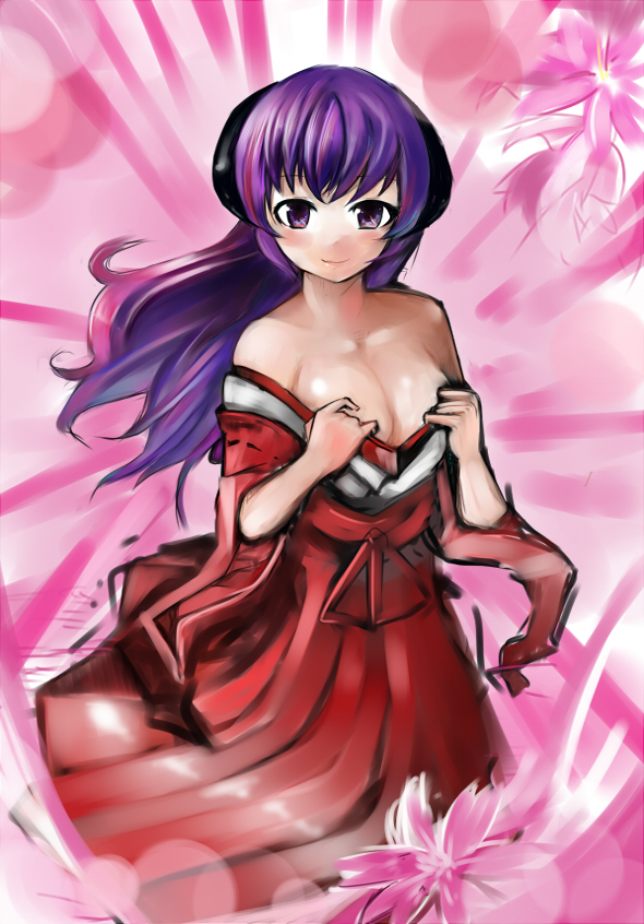 00s1girlbare shouldersbreastscleavagefemale focusflowerhakamahakama skirthornsjapanese clotheslarge breastslong hairmikooff shoulderpurple eyespurple hairred hakamaskirtsoloundressing