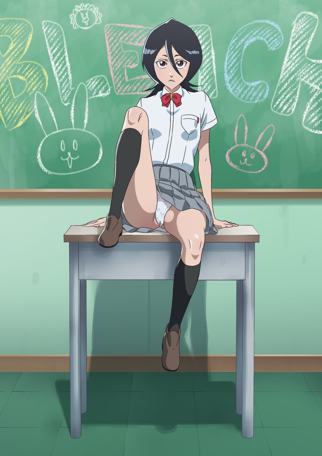 1girl2023animal earsarms at sidesblack hairblack socksbowbreast pocketbrown shoescameltoechalkchalkboardclothes liftcopyright namedeskdrop shadowflashingflat chestfrownfull bodygrey skirthair between eyesindoorskarakura high school uniformknee upkneehighsleg uplegsloaferslooking at viewermedium hairminiskirton deskpantiespetitepleated skirtpocketpurple eyespussyrabbit earsred bowschoolschool deskschool uniformshiny skinshirtshoesshort sleevessittingskirtskirt liftsockssolothighstile floortilesunderwearupskirtwhite pantieswhite shirt