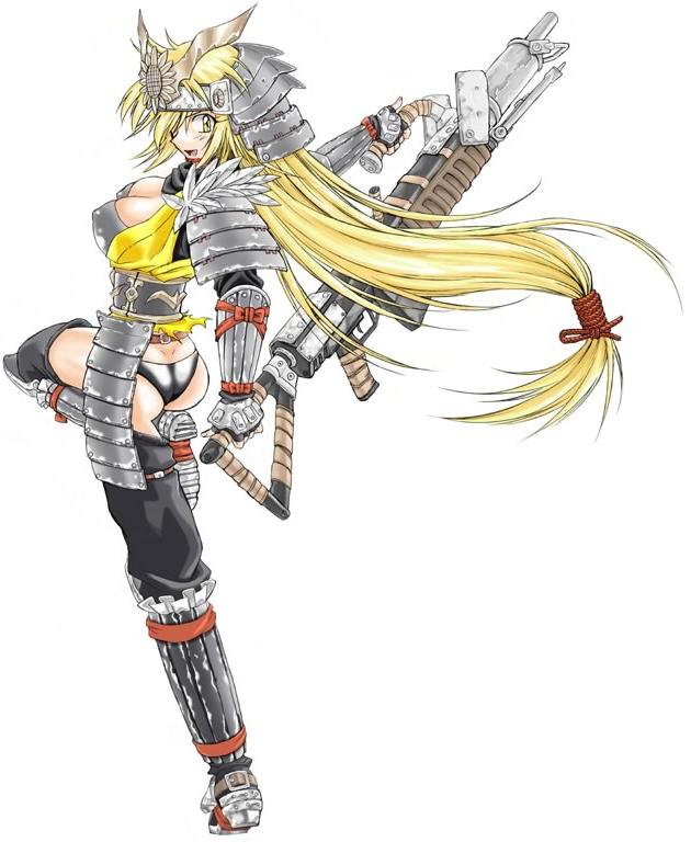 00s1girlarmorblonde hairbreastscomicfemale focusfull bodygunhelmetjapanese armorlong hairmachine gunsimple backgroundsoloswimsuitweaponyellow eyes