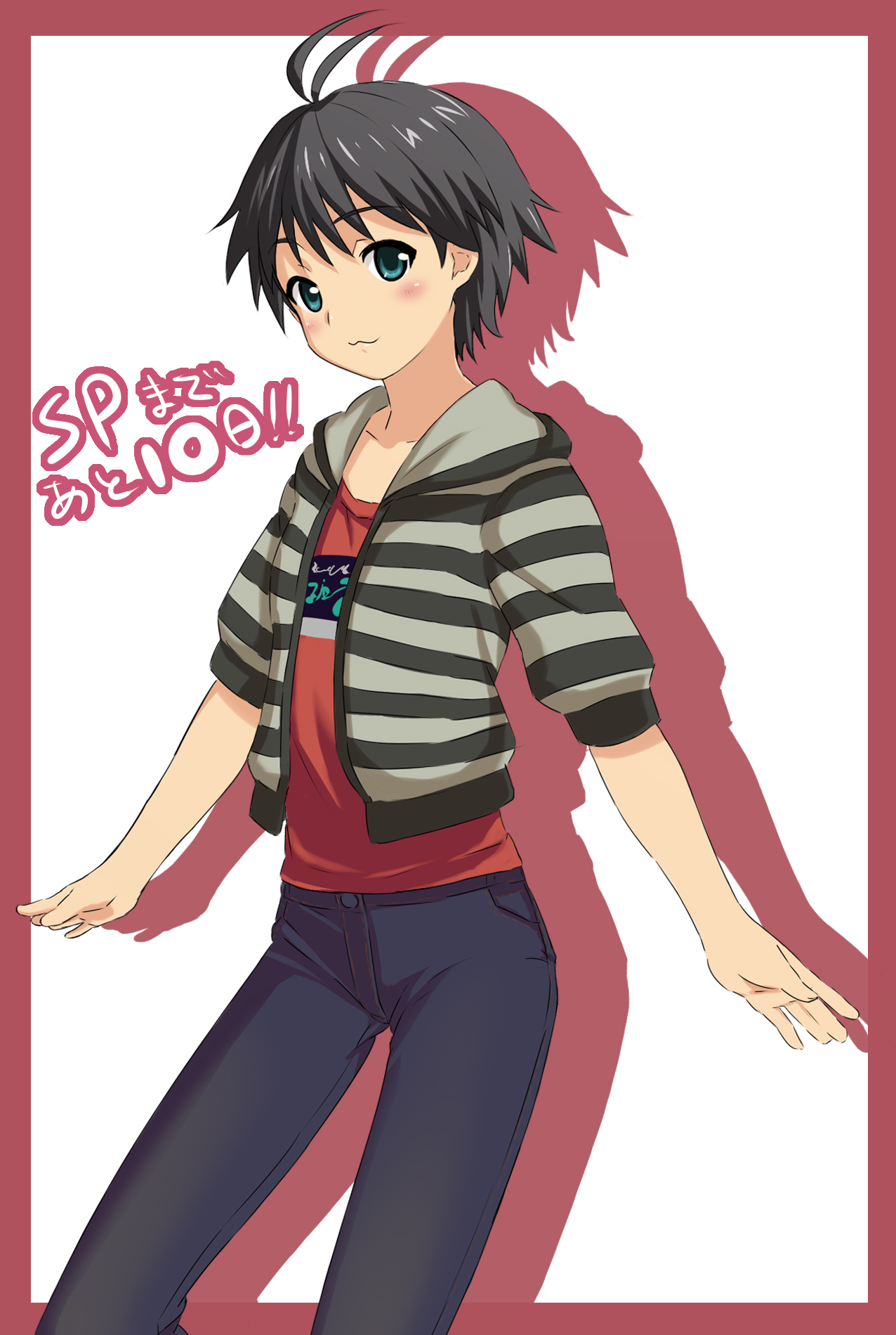 :300s1girlahogeantenna hairblack hairblue eyescasualdenimfemale focusflat chesthoodhoodiejeanspantsshort hairsimple backgroundsolo