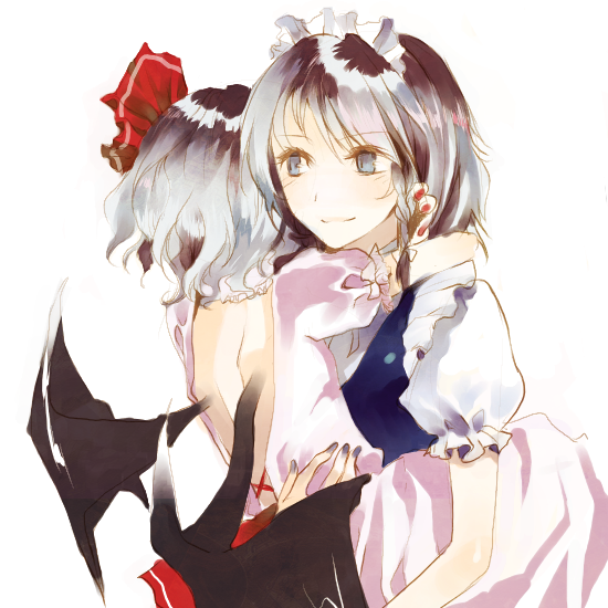 2girlsbackbat wingsbraidbreastsdressfemale focusgrey eyesgrey hairhugmultiple girlsnail polishshort hairwhite backgroundwings