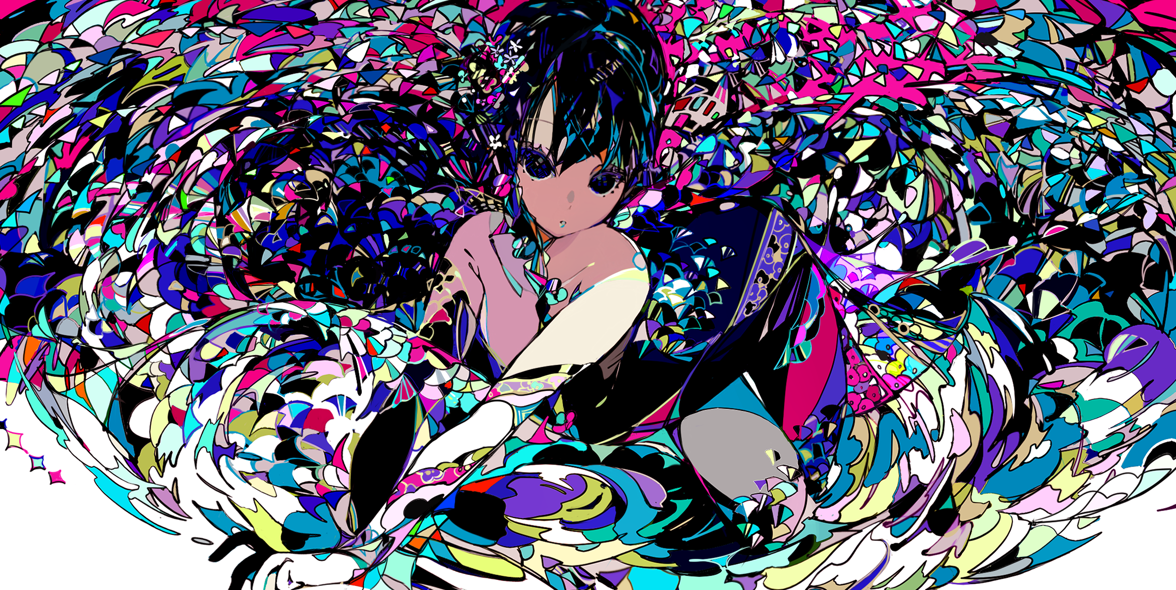1girlabstractbare shouldersblack eyesblack hairexpressionlesslooking at viewermosaic patternparted lipssolo