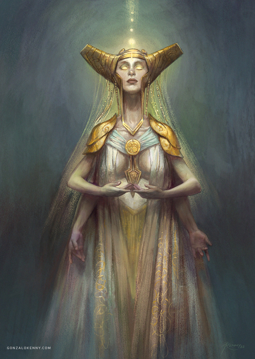1girlarmorbreastscenter openingcleavagecollarbonedressextra armsglowingglowing eyesgold helmetgradient backgroundhelmetjewelrylarge breastslong dresslow necklineprayingshoulder armorveilyellow eyes