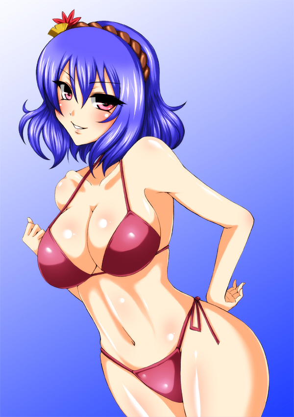 1girlbikiniblue hairblushbreastsfemale focusgradient backgroundhairbandhand on own hiplarge breastslooking at viewernavelred eyessoloswimsuitwhite background