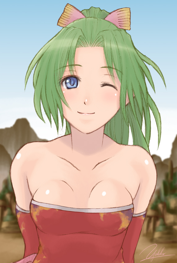 1990s (style)1girlbare shouldersblue eyesbowbreastsfemale focusgreen hairhair bowlong hairone eye closedoutdoorssignaturesketchskysmall breastssmilesolowink