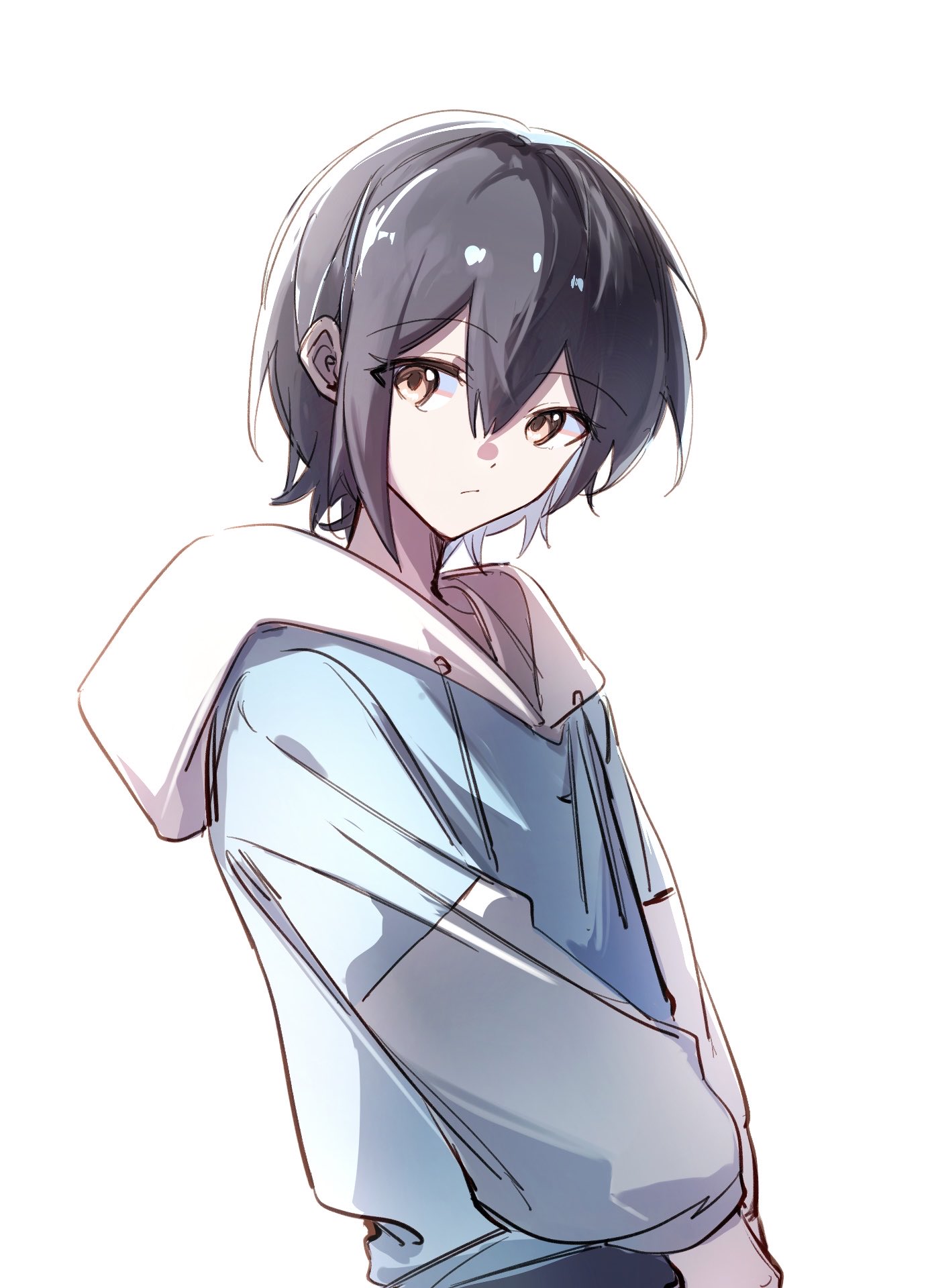1girlblue hoodiebrown eyesclosed mouthgrey hairhair between eyeshoodhood downhoodielong sleevesshort hairsidelockssimple backgroundsolowhite background