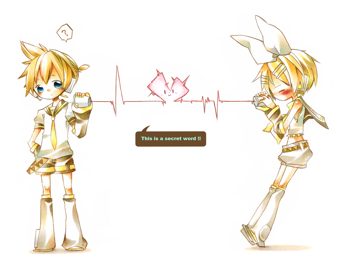1boy1girlblonde hairblue eyesblushbrother and sisterchibidetached sleevesenglish texthair ornamenthairclipheadphonesheartnecktiephoneribbonsiblingsstring phonetwins