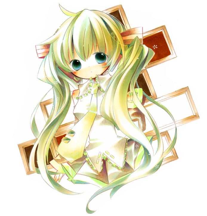 kanaria, rozen maiden, lowres, 00s, 1girl, :d, blush, dress, drill hair, female focus, green eyes, green hair, long sleeves, looking at viewer, matching hair/eyes, oekaki, open mouth, orange background, qvga, short hair, simple background, smile, solo, twin drills, umbrella, yellow dress