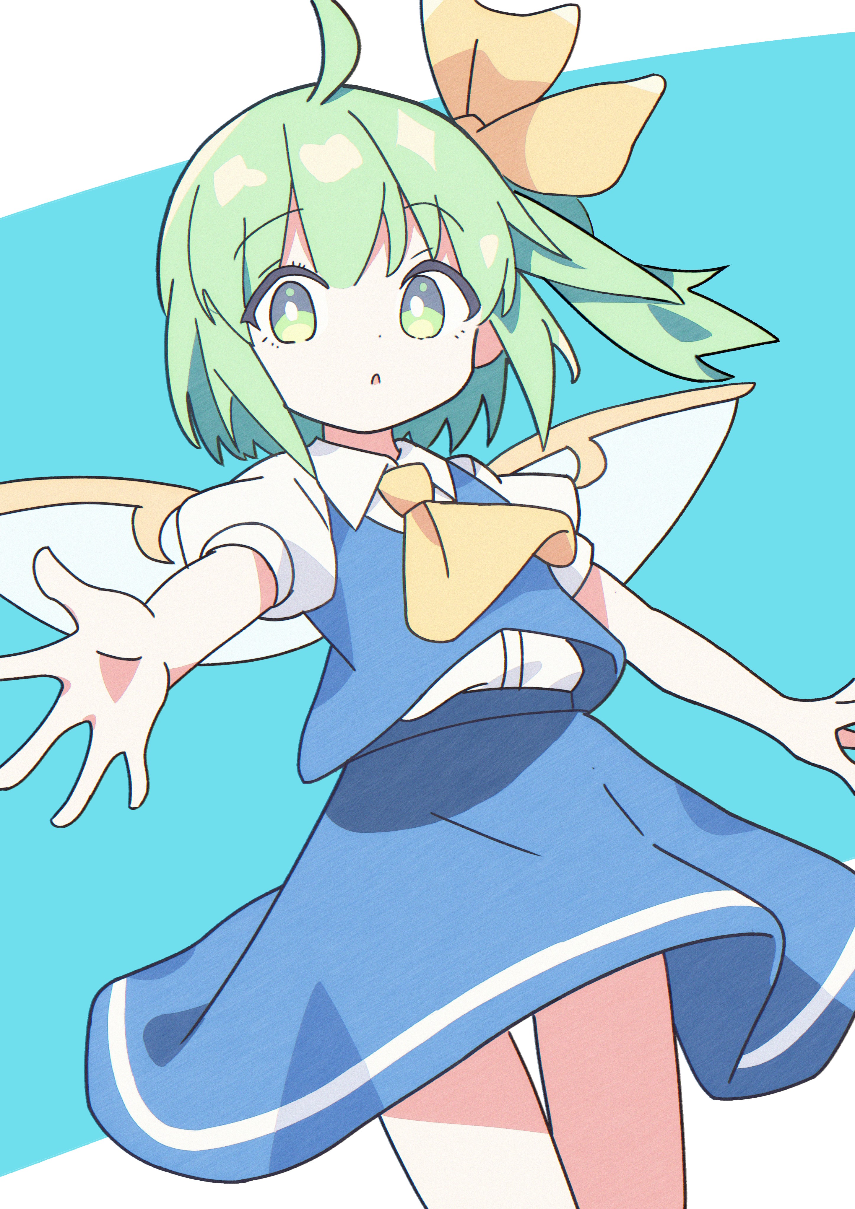 :o1girlahogeascotbare armsbeckoningblack201 wavblue skirtblue vestfairyfairy wingsgreen eyesgreen hairhair ribbonlooking at viewerone side uppuffy short sleevespuffy sleevesribbonshirtshirt tucked inshort sleevessimple backgroundskirtskirt setsolothighsvestwhite shirtwingsyellow ascotyellow ribbon