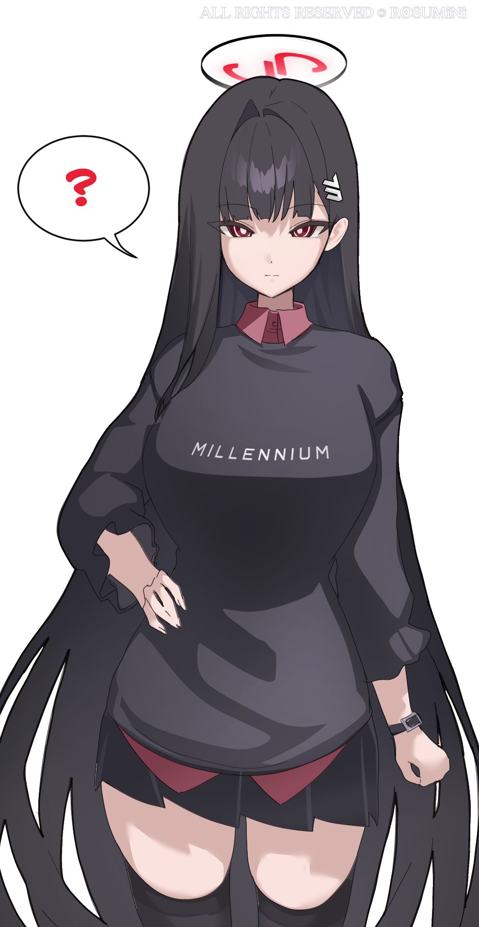1boy1girlblack hairblack skirtblack thighhighscopyright noticehair intakeshair ornamenthairpinhalohand on own hiplong hairlooking at viewerred eyesred shirtshirtskirtspeech bubblethighhighsvery long hairwhite backgroundzettai ryouiki