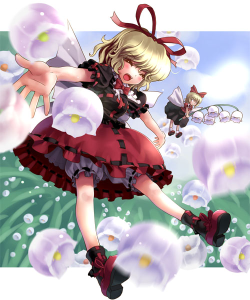 benio (dontsugel), aizawa azusa, slime taoshite 300 nen shiranai uchi ni level max ni nattemashita, highres, novel illustration, official art, 1girl, ascot, blonde hair, blue eyes, blue sky, boots, bow, broom, broom riding, casting spell, fisheye, full body, hat, hat bow, large hat, long hair, long sleeves, looking at viewer, magic, open mouth, skirt, sky, solo, sparkle, wide sleeves, witch, witch hat