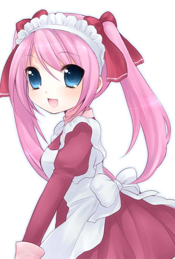 blue eyesbowfrom sidehair bowmaidmaid headdresspink hairsimple backgroundsmilesolotwintailswhite background