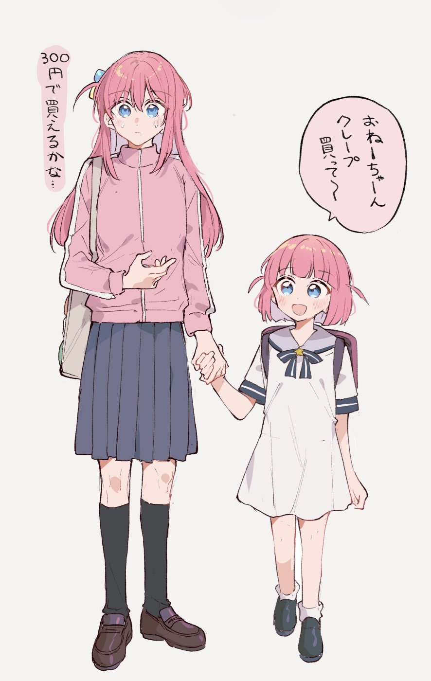 2girlsbackpackbagblue eyeshair ornamentholding handsjacketmultiple girlspink hairpink jacketschool uniformsiblingsspeech bubble