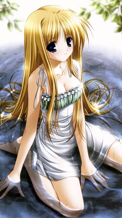 1girlblonde hairblue eyesbreastscleavagedressfemale focuslong hairsolosubmergedsundressvery long hairwaterwetwet clothes
