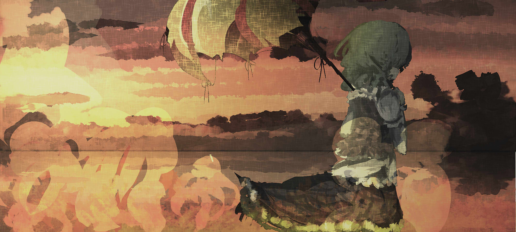 1girlfaux traditional mediafemale focusgreen hairnatureparasolplaid clothesplaid skirtplaid vestshort hairskirtskirt setsolosunsetumbrellavest