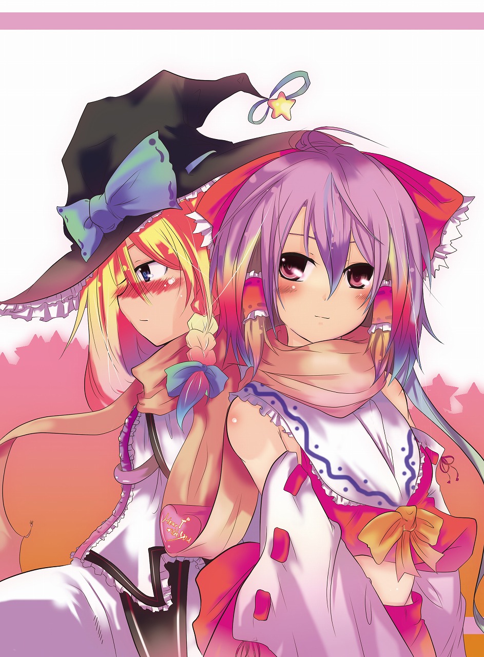 2girlsblonde hairblushbraidenglish textengrish textfemale focusgradient hairhatheartjapanese clotheslong hairmidriffmikomulticolored hairmultiple girlsranguageribbonscarfshared clothesshared scarfshort hairskirtwitchwitch hat