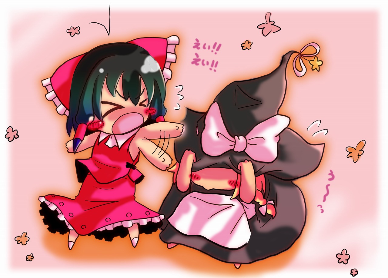 1boy2girlsblonde hairblush stickersbraidcharisma guardchibiclosed eyescoweringfemale focushathat tughittingjapanese clothesmikomultiple girlsribbonwitchwitch hat