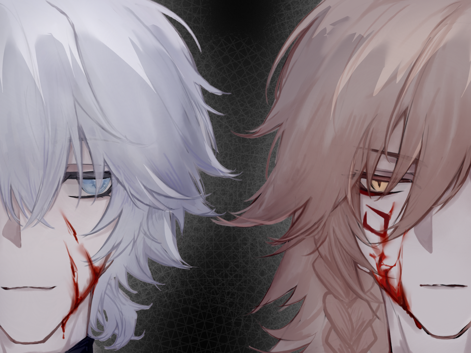 2boysantenna hairblack backgroundblack chokerblonde hairbloodblood on faceblue eyesbraidchokerfacial tattoogradient hairmale focusmedium hairmulticolored hairmultiple boysqianling62749red hairred tattooshort hairside braidsimple backgroundtattoowhite hairyellow eyes