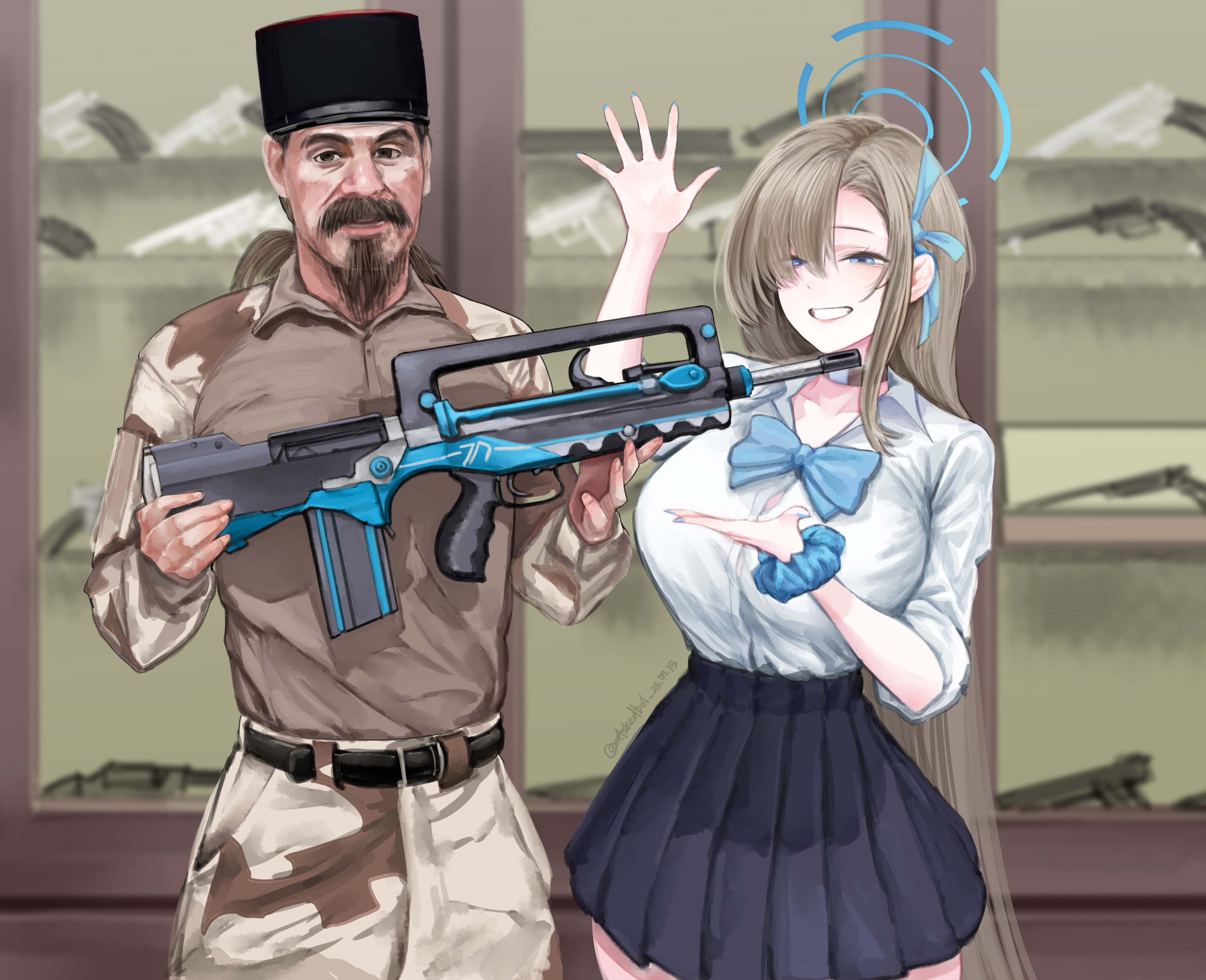 cryne, abby (wuthering waves), wuthering waves, absurdres, commentary, highres, 1other, ahoge, ambiguous gender, black skirt, blue eyes, cloak, cropped torso, droopy ears, earrings, game screenshot inset, hands on own hips, heterochromia, humanization, jewelry, light blush, long hair, long sleeves, looking to the side, reference inset, simple background, skirt, symbol-shaped pupils, tacet mark (wuthering waves), twitter username, white background, white cloak, white hair, yellow eyes