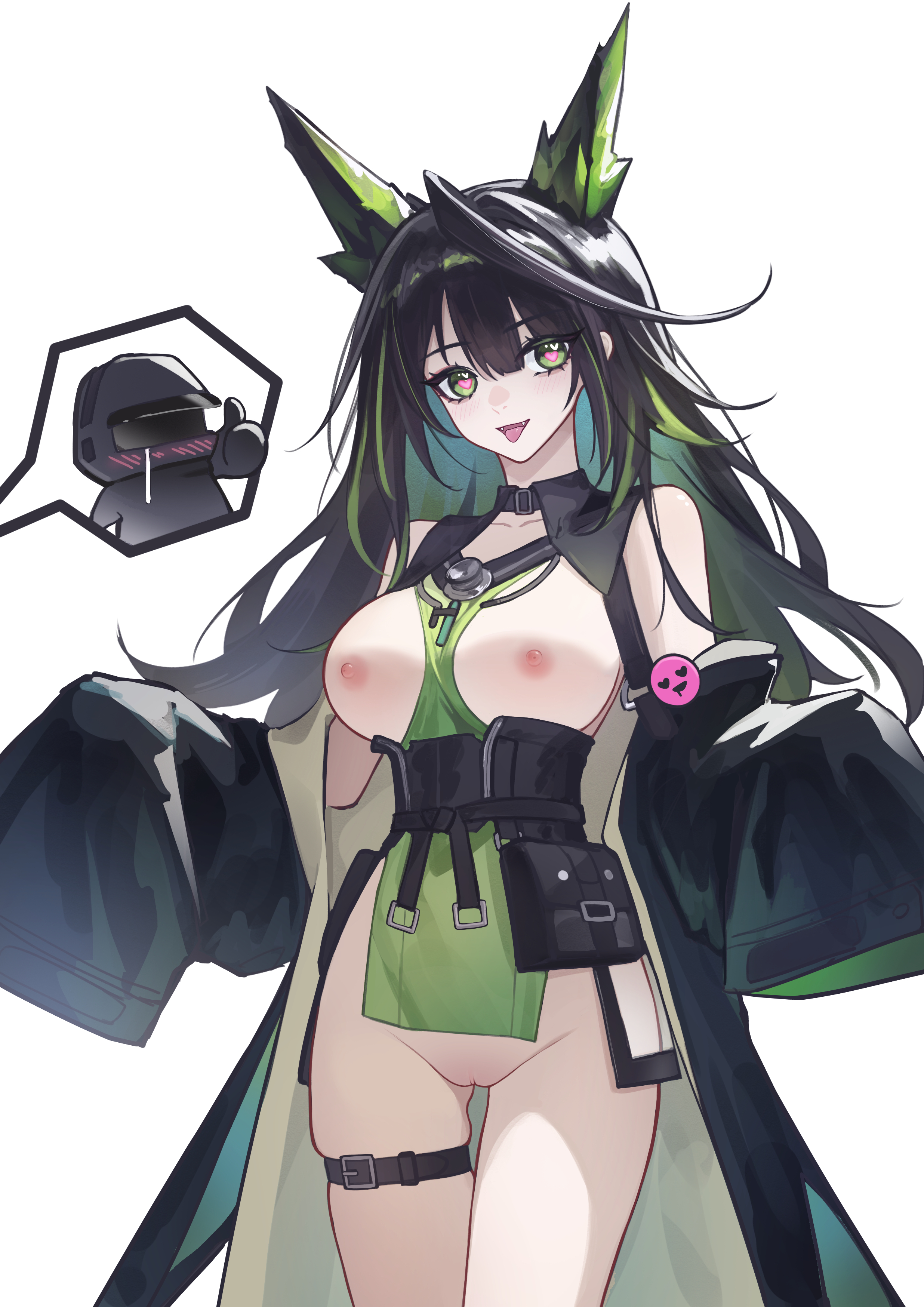 1girlbare shouldersbeltblack coatblack hairbreastsbreasts outclothes downcoatcolored inner hairdressgreen dressgreen eyesgreen hairgroinheartheart-shaped pupilslarge breastslooking at viewermulticolored hairnipplesno pantiesopen clothesopen coatopen mouthpelvic curtainpussysee-through clothesshort dresssimple backgroundsmilesolostreaked hairsymbol-shaped pupilsthigh beltthigh strapthighstonguetongue outwhite background