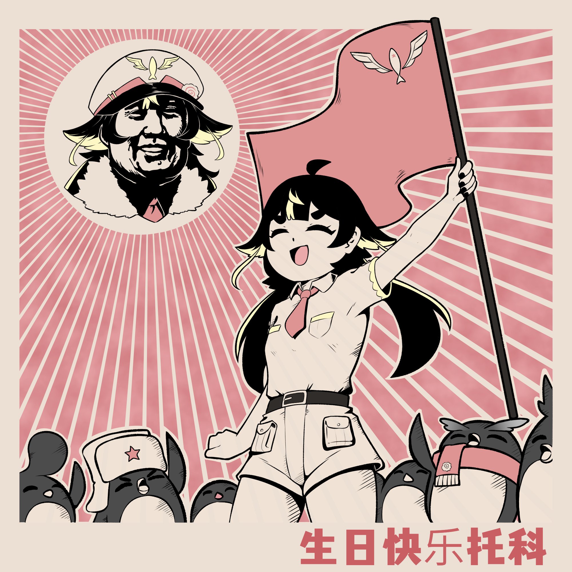 1girlahogearm upbeltbelt bucklebirdblack hairblonde hairborderbreast pocketbucklecapechinese textclosed eyescollared shirtcultural revolutionflagfur trimfur-trimmed capehair flapshatholdingholding flaglow twintailsmonochromenecktieparodypeaked cappenguinpocketred backgroundred necktieshirtshirt tucked inshort shortsshort sleevesshortsspot colorsunburstsunburst backgroundthick eyebrowstoko (vtuber)twintailsvirtual youtuberwhite borderwing collar