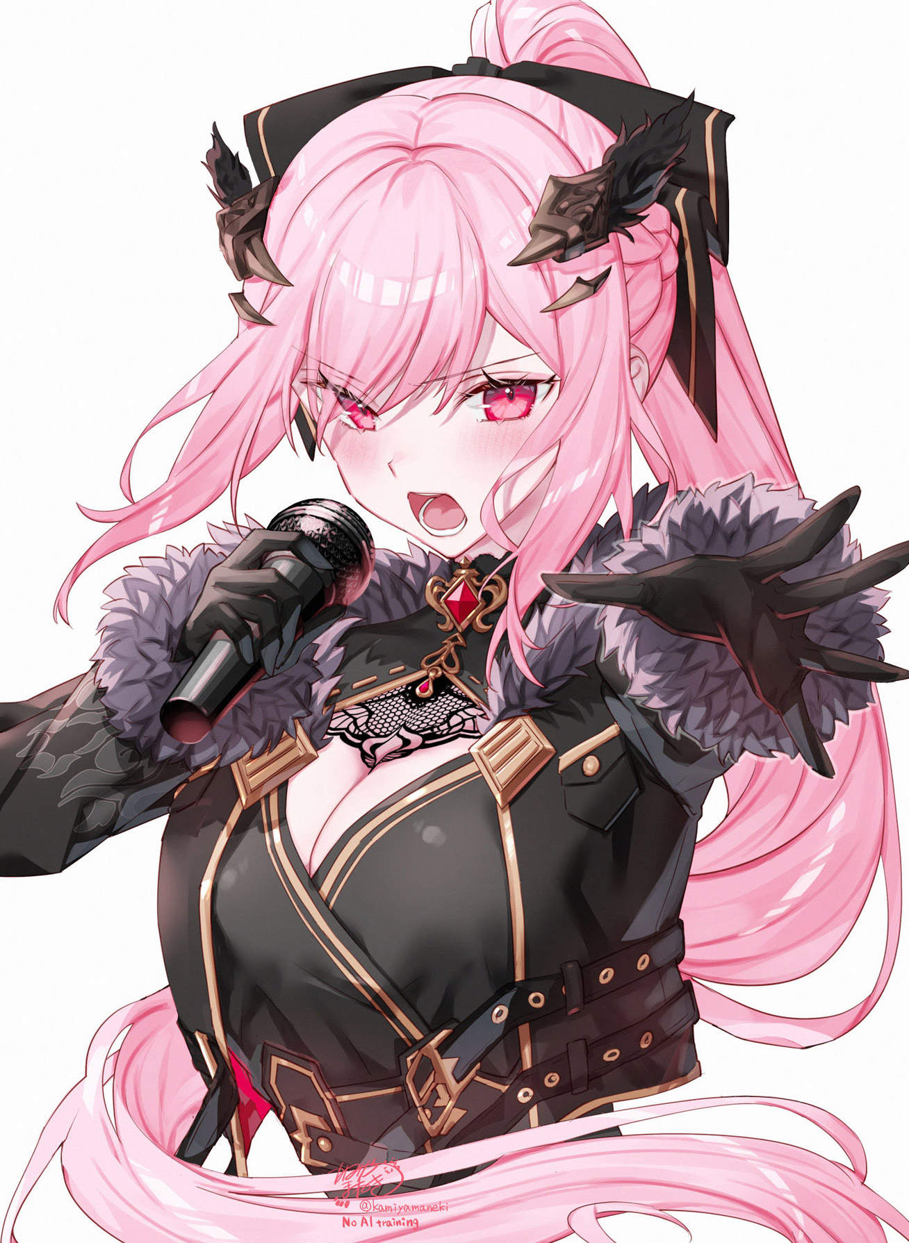 1girlartist namebeltblack beltblack dressblack glovesblack jacketblack ribbonblushbreastscleavagedressfur trimfur-trimmed jacketgloveshair ornamenthair ribbonhalf updohigh ponytailholdingholding microphonejacketlarge breastslong hairlooking at viewermicrophoneofficial alternate costumeopen mouthpink eyespink hairponytailribbonsignaturesimple backgroundsoloteethtwitter usernamevirtual youtuberwhite background