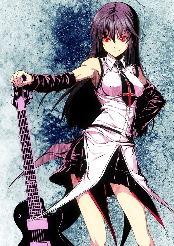 1girlarmpitsbare shouldersbeltblack hairbreastsclenched handcovered erect nipplescrossdetached sleeveselectric guitarfemale focusguitarhair between eyeshand on own hipholdinginstrumentlong hairlooking at viewermedium breastsminiskirtnecktiepleated skirtred eyesskirtsmilesmirksolostanding