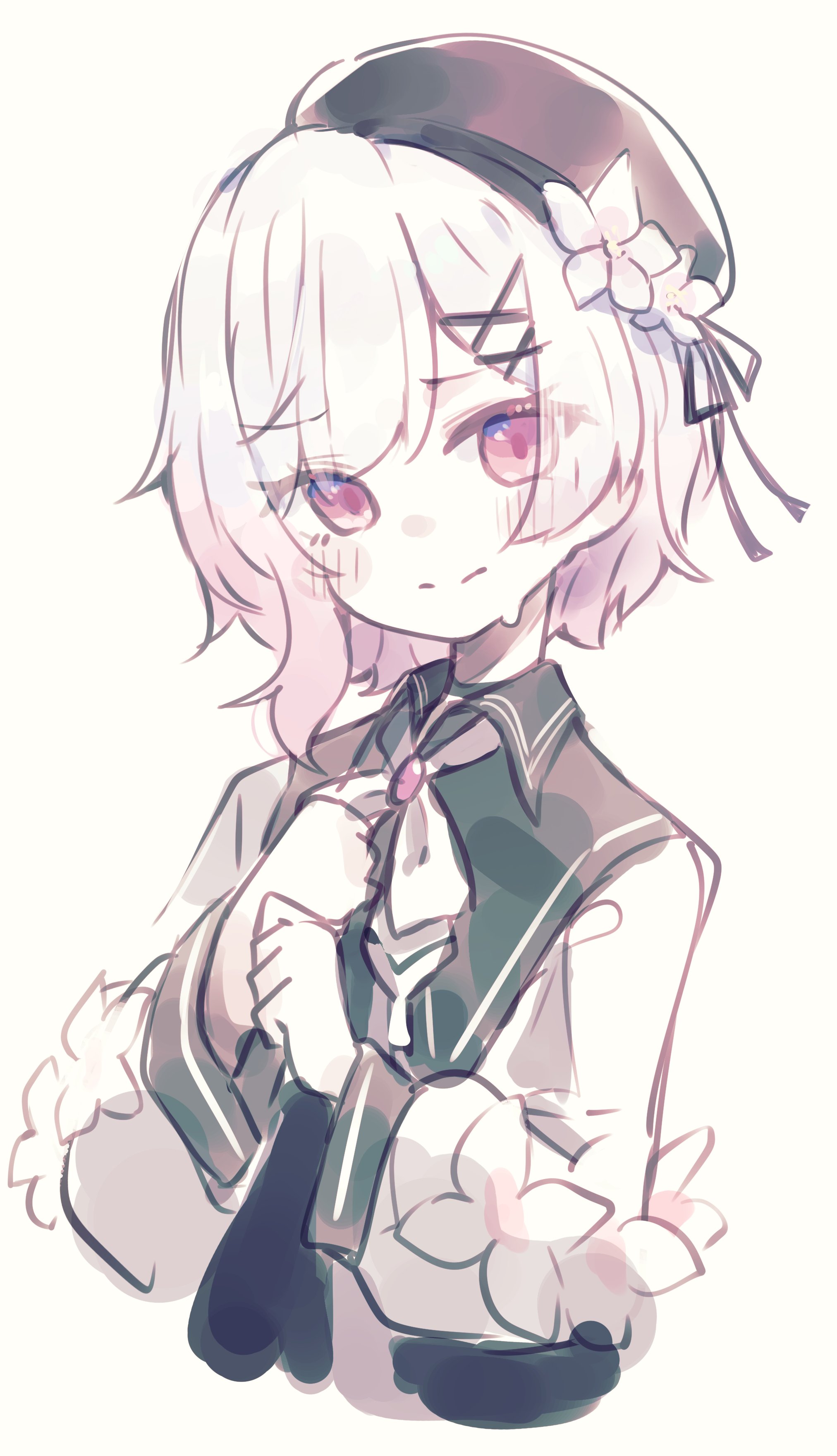 1girlberetblack hatflowerflower ornamentgradient hairhair ornamenthathat flowerlight smilelooking at viewermagical girlmulticolored hairpink eyespink hairshirtshort hairsimple backgroundsolosweatdropwhite backgroundwhite flowerwhite hairwhite shirtx hair ornament