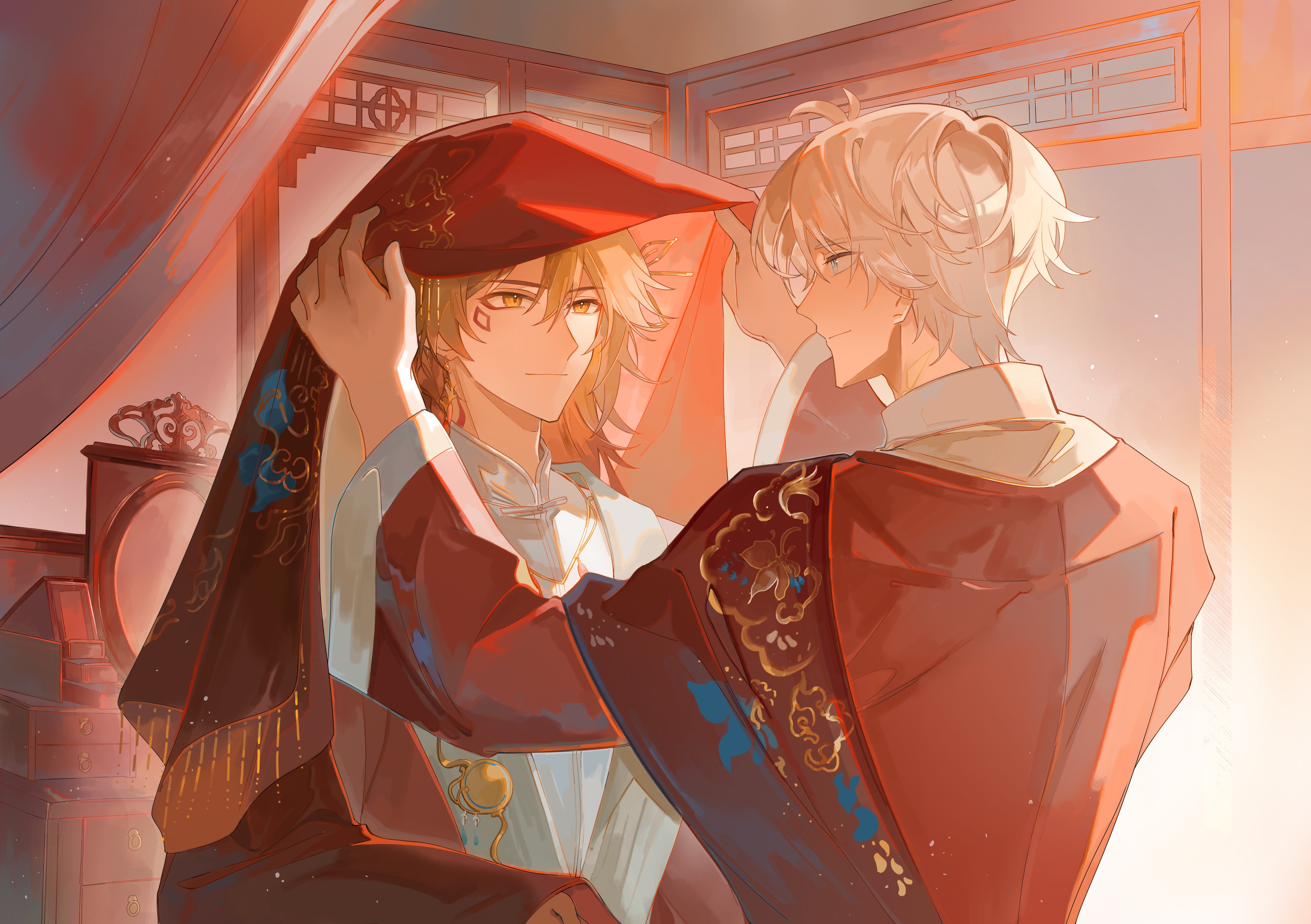 2boysantenna hairblonde hairblue eyesbraidchinese clothescollared shirtfacial tattoogradient hairjacketmale focusmedium hairmulticolored hairmultiple boysparted bangsred hairred jacketred tattoored veilshirtshort hairside braidtattooveilwhite hairwhite shirtyaoiyellow eyes