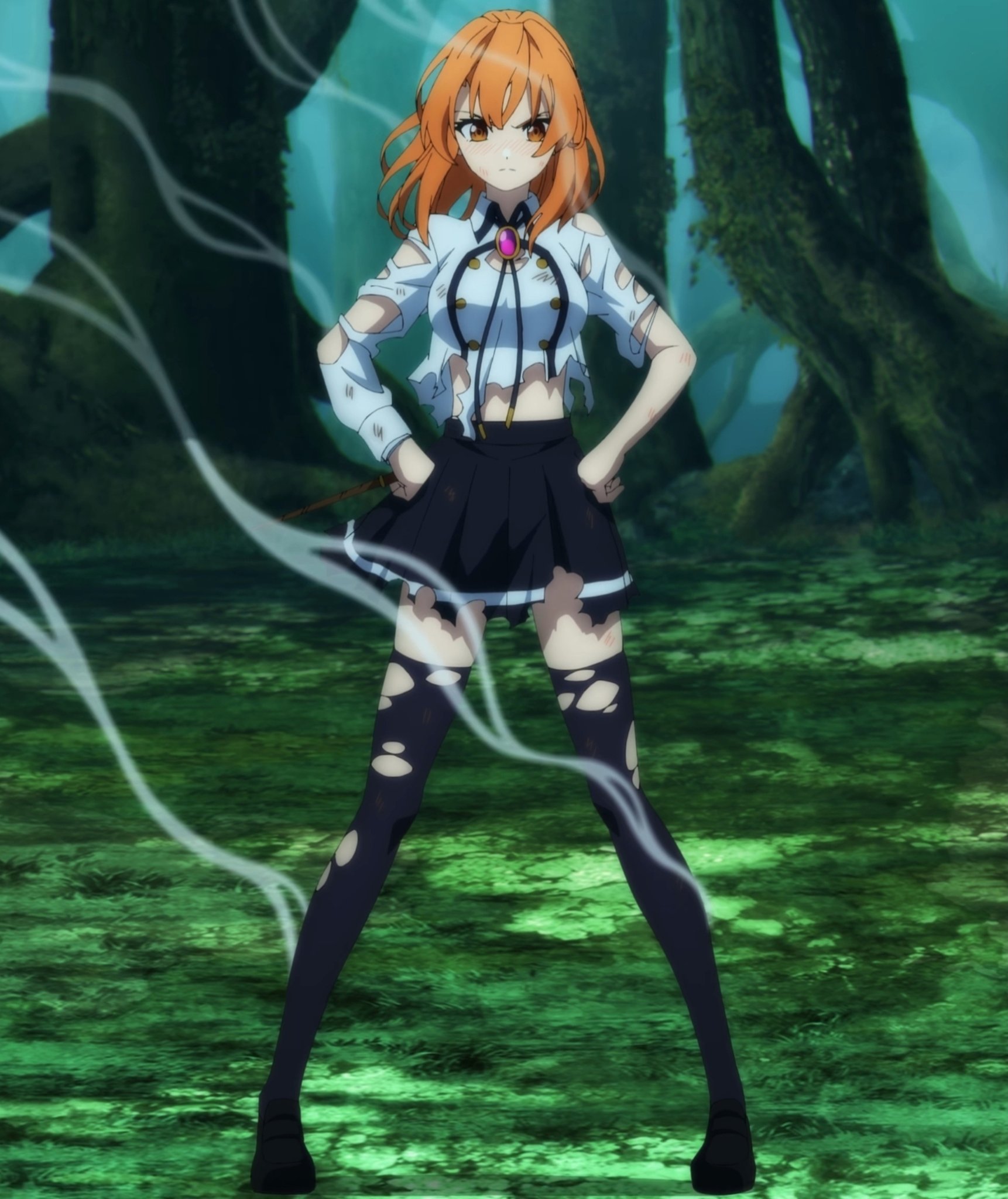 1girlblack shoesblack skirtblack socksblack thighhighsbreastsbrown eyeschest jewelclosed mouthcollared shirtdot nosefemale focusforestfull bodygemhand on own hipjunglelong sleeveslooking at viewermedium breastsmedium hairmidriffminiskirtnaturenavelno braorange hairpleated skirtpurple gemstoneschool uniformsexually suggestiveshirtshoesskirtsmokesmoke trailsockssolosolo focusstomachthighhighstorn clothestorn shirttorn skirttorn sleevestreewhite shirtzettai ryouiki
